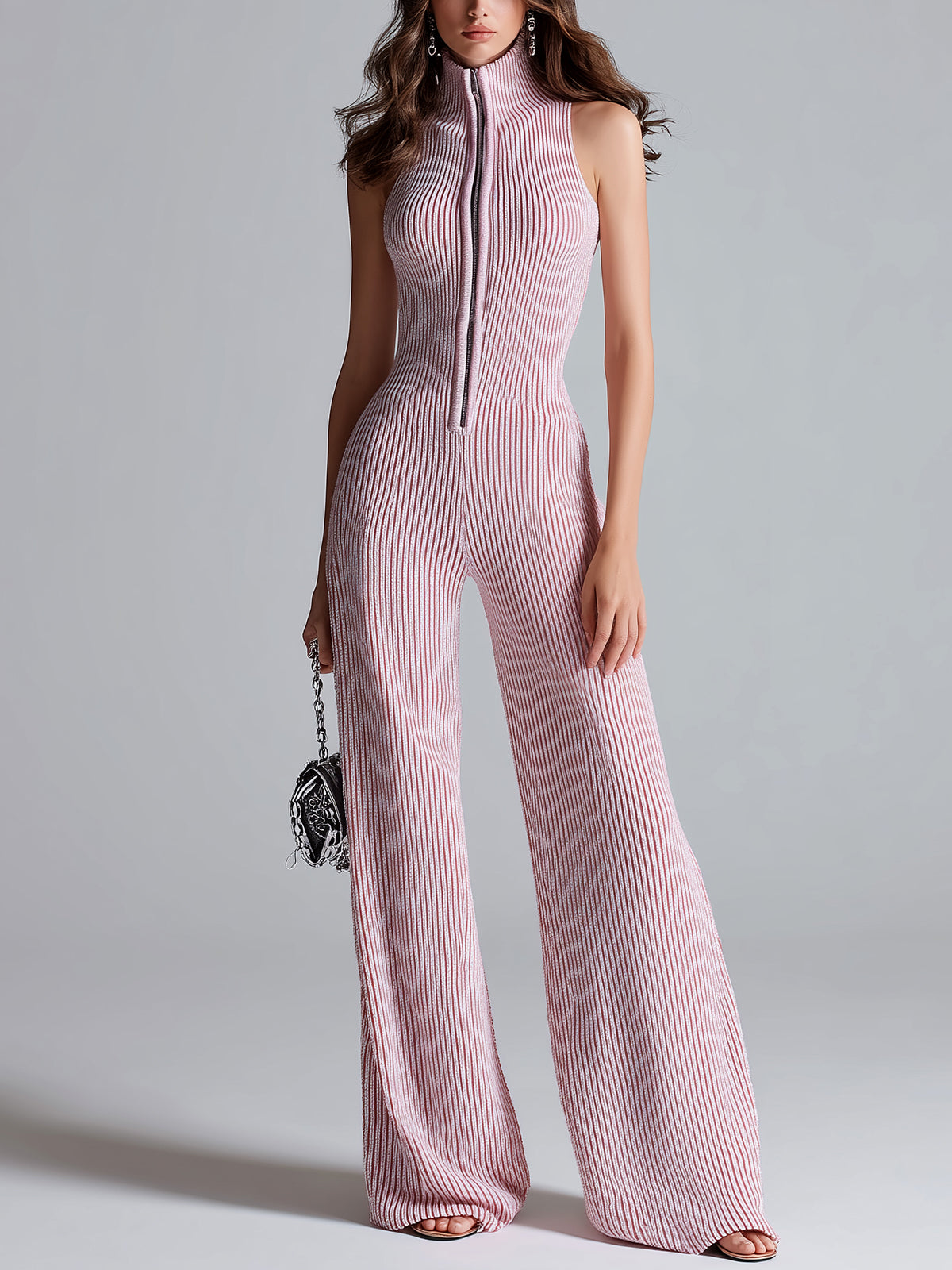 ElevenOra Stilvoller Pinker Ärmelloser Jumpsuit mit Stehkragen, Reißverschluss vorne, Tailliertem Bund und Weitem Bein im Ribstrickdesign